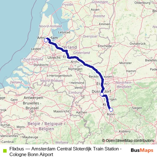 The first stop of the Flixbus bus route is Amsterdam Piarcoplein P+R Sloterdijk and the last stop is Cologne / Bonn Airport Busterminal. Flixbus (Amsterdam Central Sloterdijk Train Station - Cologne Bonn Airport) is operational during am Wochenende.