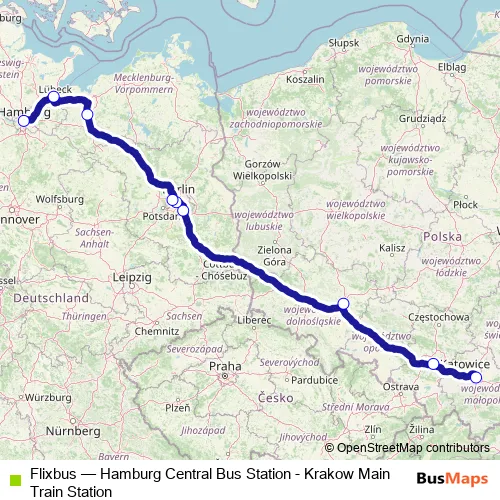 The first stop of the Flixbus bus route is Krakow Central Bus Station and the last stop is Hamburg Central Bus Station. Flixbus (Hamburg Central Bus Station - Krakow Main Train Station) is operational during täglich.