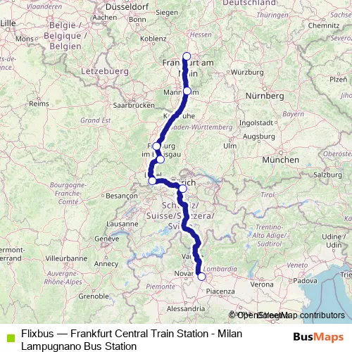 The first stop of the Flixbus bus route is Milan Lampugnano Bus Station. and the last stop is Frankfurt Central Train Station (Stuttgarter Str.). Flixbus (Frankfurt Central Train Station - Milan Lampugnano Bus Station) is operational during täglich.