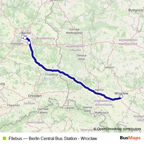 The first stop of the Flixbus bus route is Berlin Central Bus Station and the last stop is Wroclaw Central Bus Station. Flixbus (Berlin Central Bus Station - Wrocław) is operational during täglich.