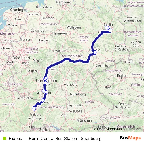 The first stop of the Flixbus bus route is Strasbourg Central Bus Station Place de l’Etoile and the last stop is Berlin Central Bus Station. Flixbus (Berlin Central Bus Station - Strasbourg) is operational during täglich.