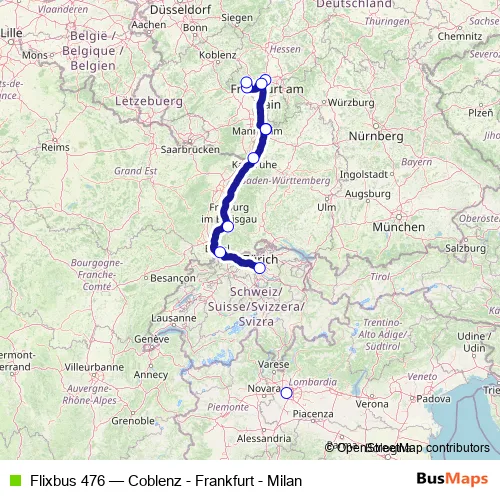 Click here to view the nearest Flixbus 476 - Coblenz - Frankfurt - Milan bus stop.