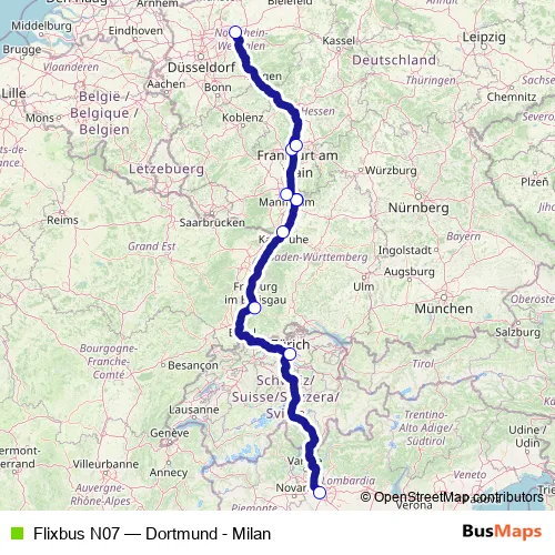 The first stop of the Flixbus N07 bus route is Milan (Lampugnano bus station) and the last stop is Dortmund central bus station. Flixbus N07 (Dortmund - Milan) is operational during täglich.