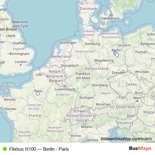 The first stop of the Flixbus N100 bus route is Berlin Airport BER (Berlin Brandenburg), Terminal 1/2 and the last stop is Paris (Pershing - Porte Maillot). Flixbus N100 (Berlin - Paris) is operational during täglich.