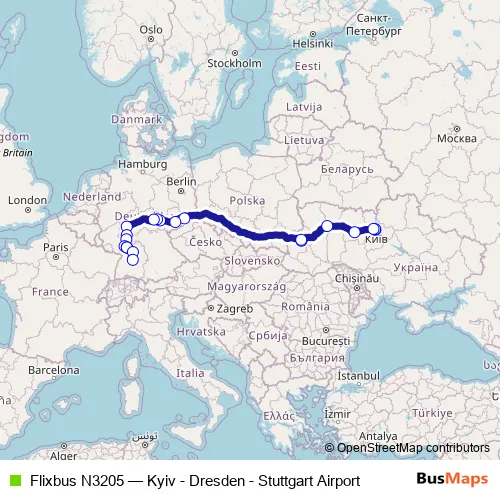 The first stop of the Flixbus N3205 bus route is Kyiv (Central Bus Station) and the last stop is Stuttgart Airport Busterminal (Sab). Flixbus N3205 (Kyiv - Dresden - Stuttgart Airport) is operational during täglich.