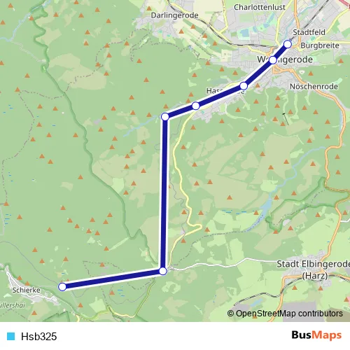 The first stop of the Hsb325 bus route is Wernigerode and the last stop is Schierke. Hsb325 is operational during am Wochenende.