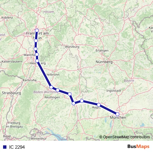 The first stop of the IC 2294 rail route is Stuttgart Hbf and the last stop is Frankfurt(Main)Hbf. IC 2294 is operational during täglich.