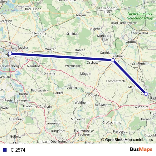 The first stop of the IC 2574 rail route is Coswig(b Dresden) and the last stop is Leipzig Hbf. IC 2574 is operational during am Wochenende.