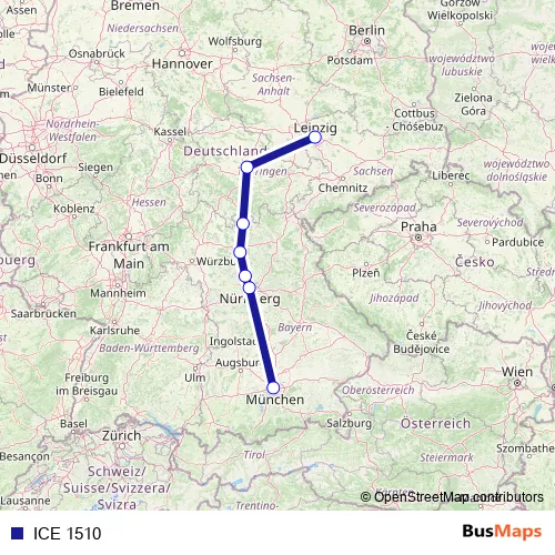 The first stop of the ICE 1510 rail route is München Hbf and the last stop is Leipzig Hbf. ICE 1510 is operational during täglich.