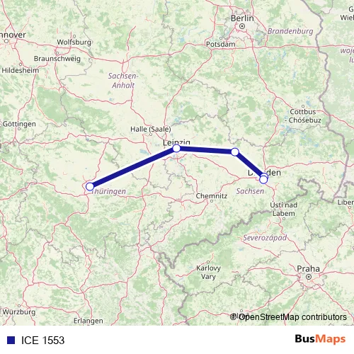 The first stop of the ICE 1553 rail route is Erfurt Hbf and the last stop is Dresden Hbf. ICE 1553 is operational during täglich.