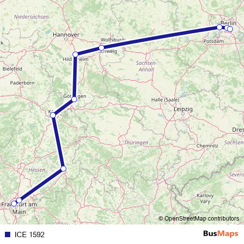 The first stop of the ICE 1592 rail route is Frankfurt(M) Flughafen Fernbf and the last stop is Berlin Ostbahnhof. ICE 1592 is operational during täglich.