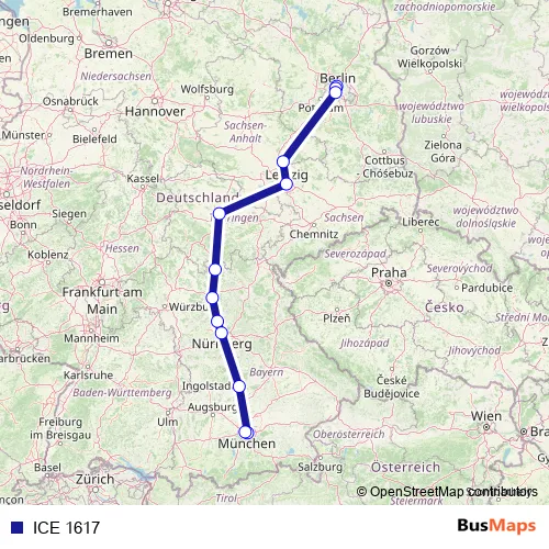 The first stop of the ICE 1617 rail route is Berlin Gesundbrunnen and the last stop is München Hbf. ICE 1617 is operational during täglich.