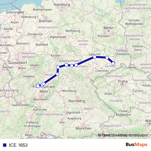 The first stop of the ICE 1653 rail route is Wiesbaden Hbf and the last stop is Dresden Hbf. ICE 1653 is operational during täglich.