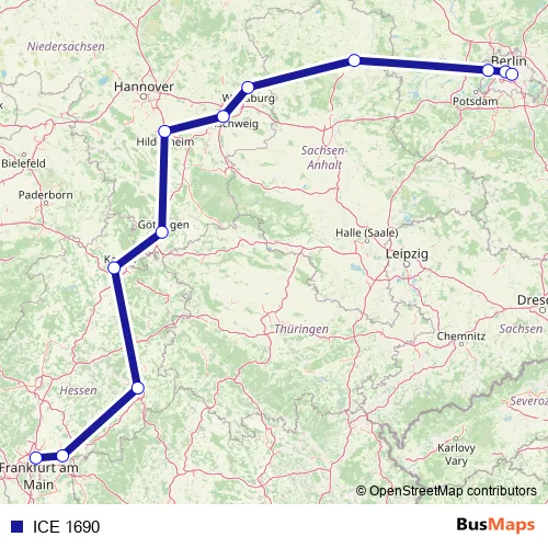 The first stop of the ICE 1690 rail route is Frankfurt(Main)Hbf and the last stop is Berlin Ostbahnhof. ICE 1690 is operational during täglich.