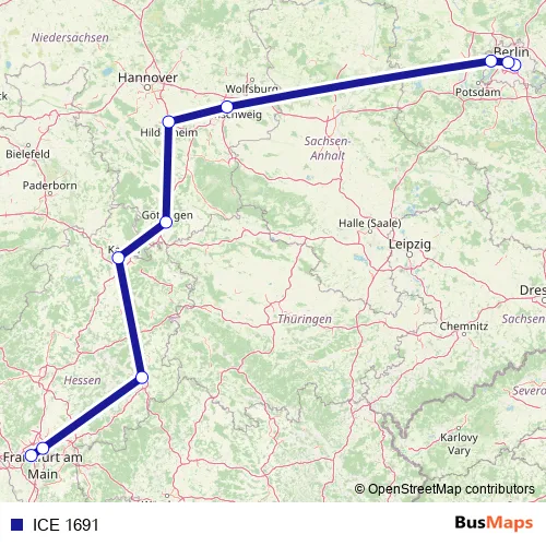 The first stop of the ICE 1691 rail route is Berlin Ostbahnhof and the last stop is Frankfurt(M) Flughafen Fernbf. ICE 1691 is operational during täglich.