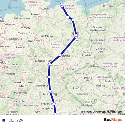 The first stop of the ICE 1724 rail route is München Hbf and the last stop is Rostock Hbf. ICE 1724 is operational during täglich.