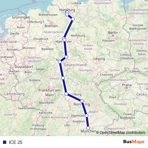 The first stop of the ICE 25 rail route is Hamburg Dammtor and the last stop is München Hbf. ICE 25 is operational during täglich.