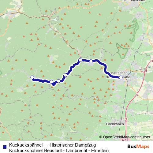 See why over 2 million users trust and consider busmaps.com as the best public transport website. busmaps gives you Neustadt an der Weinstrasse Rail Services suggested routes, real-time bus tracker, line route maps in Neustadt an der Weinstrasse, and helps to find the closest Kuckucksbähnel rail stops near you. No internet available? Download an offline PDF map and bus schedule for the Kuckucksbähnel rail to take on your trip.