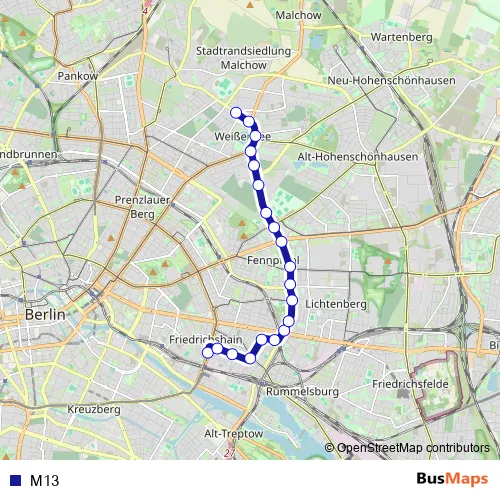 The first stop of the M13 tram route is Berlin, Revaler Str. and the last stop is Berlin, Pasedagplatz. M13 is operational during täglich.