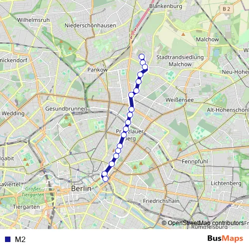 See why over 2 million users trust and consider busmaps.com as the best public transport website. busmaps gives you Berlin Trams suggested routes, real-time bus tracker, line route maps in Berlin, and helps to find the closest M2 tram stops near you. No internet available? Download an offline PDF map and bus schedule for the M2 tram to take on your trip.