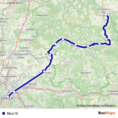 The first stop of the Mex19 bus route is Hessental Bahnhof Bstg 2 and the last stop is Hauptbf (A.-Klett-Pl.) Pos 1. Mex19 is operational during täglich.