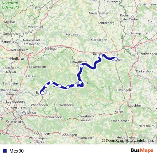 The first stop of the Mex90 bus route is Backnang ZOB Bstg 2c and the last stop is Crailsheim ZOB Bstg 7. Mex90 is operational during täglich.