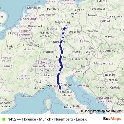 The first stop of the N452 bus route is Florence (Villa Costanza) and the last stop is Leipzig, Hauptbahnhof/Ostseite. N452 (Florence - Munich - Nuremberg - Leipzig) is operational during täglich.