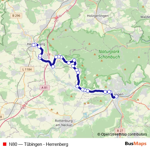 The first stop of the N80 bus route is Tübingen Hauptbahnhof and the last stop is Herrenb. ZOB Bahnhofstraße. N80 (Tübingen - Herrenberg) is operational during am Wochenende.