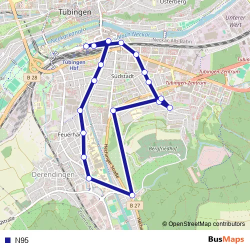 See why over 2 million users trust and consider busmaps.com as the best public transport website. busmaps gives you Tuebingen Buses suggested routes, real-time bus tracker, line route maps in Tuebingen, and helps to find the closest N95 bus stops near you. No internet available? Download an offline PDF map and bus schedule for the N95 bus to take on your trip.