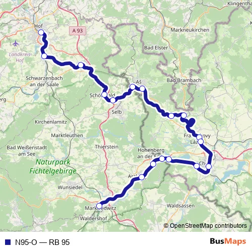 The first stop of the N95-O rail route is Hof Hbf and the last stop is