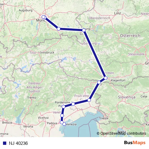 The first stop of the NJ 40236 rail route is Venezia Santa Lucia and the last stop is München Hbf. NJ 40236 is operational during täglich.