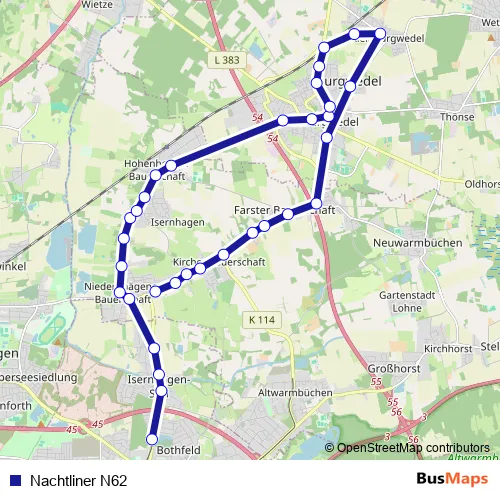 The first stop of the Nachtliner N62 bus route is Hannover Stadtfriedhof Bothfeld and the last stop is Isernhagen Auf dem Windmühlenberge. Nachtliner N62 (Nachtliner N62) is operational during am Wochenende.