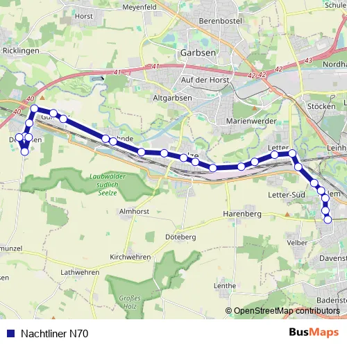 The first stop of the Nachtliner N70 bus route is Hannover Ahlem and the last stop is Dedensen Raiffeisenstraße. Nachtliner N70 (Nachtliner N70) is operational during am Wochenende.