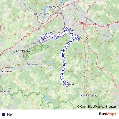 The first stop of the Ne4 bus route is Hagen Hbf and the last stop is Breckerfeld Busbahnhof. Ne4 is operational during täglich.