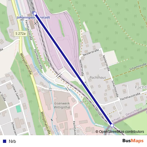 The first stop of the Nrb rail route is Johanngeorgenstadt, Bahnhof and the last stop is Potucky(Gr). Nrb is operational during täglich.