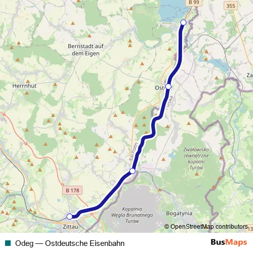 The first stop of the Odeg rail route is Hagenwerder and the last stop is Zittau. Odeg (Ostdeutsche Eisenbahn) is operational during täglich.