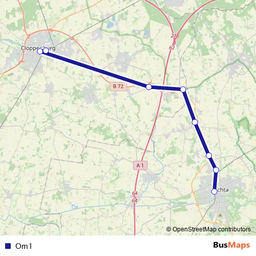 The first stop of the Om1 bus route is Vechta Zob and the last stop is Cloppenburg Bahnhof. Om1 is operational during täglich.