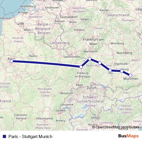 The first stop of the Paris - Stuttgart Munich rail route is Paris Est and the last stop is Munich. Paris - Stuttgart Munich (Paris - Stuttgart Munich) is operational during täglich.