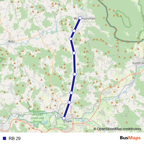The first stop of the RB 29 bus route is Cham(Oberpf) and the last stop is Waldmünchen. RB 29 is operational during täglich.