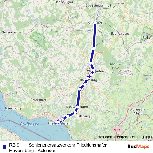 Click here to view the nearest RB 91 - Schienenersatzverkehr Friedrichshafen - Ravensburg - Aulendorf bus stop.