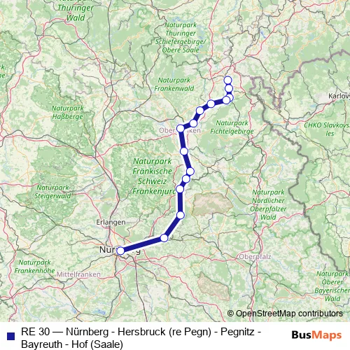 The first stop of the RE 30 rail route is Hof (Saale) Hbf and the last stop is Nürnberg Hbf. RE 30 (Nürnberg - Hersbruck (re Pegn) - Pegnitz - Bayreuth - Hof (Saale)) is operational during täglich.