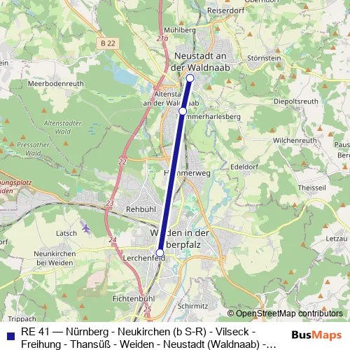Click here to view the nearest RE 41 - Nürnberg - Neukirchen (b S-R) - Vilseck - Freihung - Thansüß - Weiden - Neustadt (Waldnaab) - Hof rail stop.