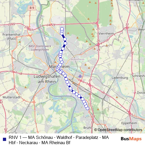 See why over 2 million users trust and consider busmaps.com as the best public transport website. busmaps gives you Mannheim Trams suggested routes, real-time bus tracker, line route maps in Mannheim, and helps to find the closest RNV 1 tram stops near you. No internet available? Download an offline PDF map and bus schedule for the RNV 1 tram to take on your trip.