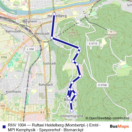Bus RNV 1004 - Ruftaxi Heidelberg (Mombertpl.-) Embl - MPI Kernphysik - Speyererhof - Bismarckpl in Heidelberg: Stops & Timetable