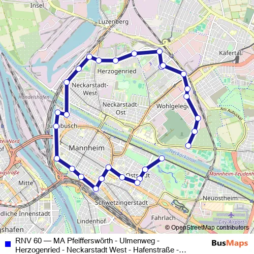 Bus RNV 60 - MA Pfeifferswörth - Ulmenweg - Herzogenried - Neckarstadt West - Hafenstraße - Schloss - Universität - MA Hauptbahnhof - MA Oststadt Schedule in Mannheim
