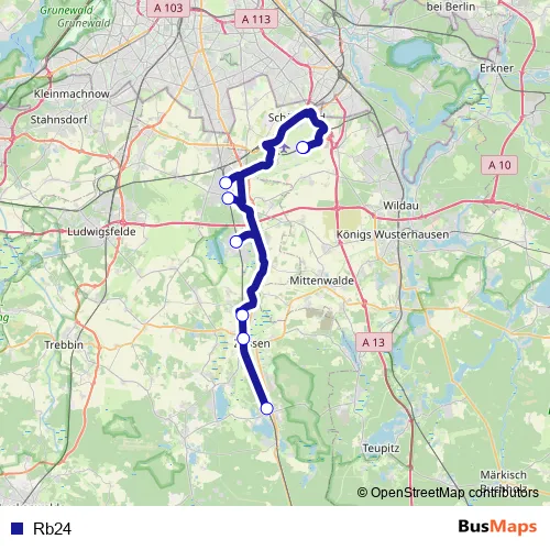 The first stop of the Rb24 bus route is Schönefeld (bei Berlin), Flughafen BER/Willy-Brandt-Platz and the last stop is Wünsdorf-Waldstadt, Bahnhof. Rb24 is operational during am Wochenende.