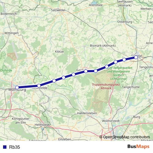 The first stop of the Rb35 bus route is Stendal Hbf and the last stop is