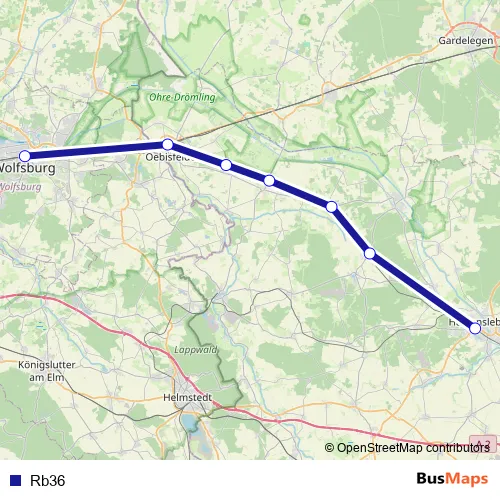 The first stop of the Rb36 bus route is Haldensleben and the last stop is Wolfsburg Hbf. Rb36 is operational during täglich.