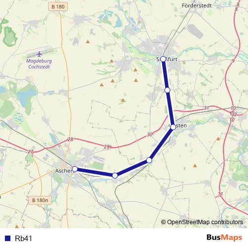 The first stop of the Rb41 bus route is Magdeburg Hbf and the last stop is Schönebeck(Elbe). Rb41 is operational during täglich.
