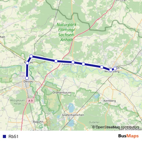 The first stop of the Rb51 bus route is Dessau, Hauptbahnhof (Tram/Bus) and the last stop is
